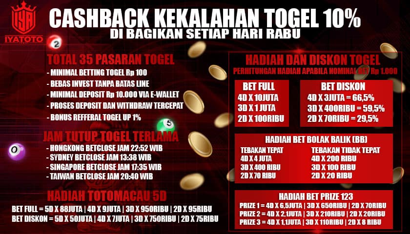 Togel, atau Toto Gelap, adalah permainan judi yang telah menjadi favorit di kalangan pemain di seluruh dunia terutama di Indonesia. Dalam permainan ini, pemain mencoba untuk menebak kombinasi angka yang akan muncul dalam hasil undian. Dengan hadiah yang menggiurkan dan kesempatan menang yang menarik, Togel telah menjadi salah satu bentuk perjudian paling populer. Di antara berbagai agen bandar togel yang ada, Iyatoto mendapatkan perhatian khusus dengan tawaran hadiah terbesar 4D hingga 10 juta.