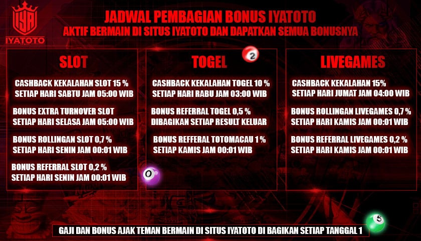 Selain togel, Iyatoto sebagai agen bandar togel terpercaya juga menyediakan bonus cashback kelahan SLOT terbesar hingga 15% setiap hari Sabtu. Jika anda sedang mencari situs judi togel 4D pasaran togel terlengkap yang ada permainan slot onlinenya juga maka Iyatoto adalah pilihan utama.